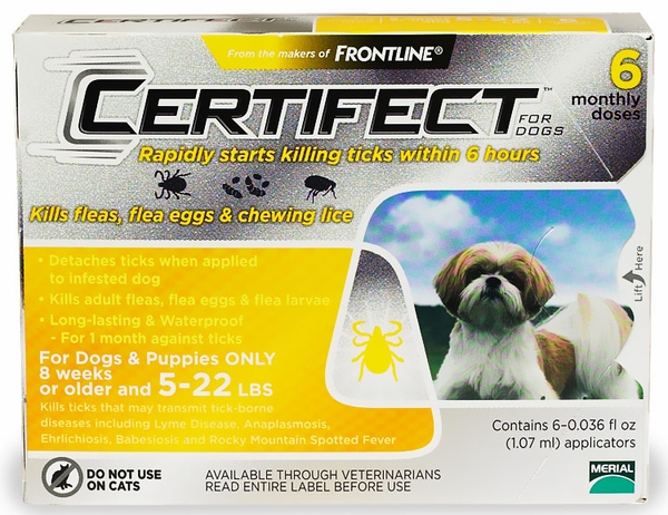 What is this product used for: Certifect for Dogs provides complete flea and tick protection by killing adult fleas and ticks rapidly and destroying the flea life cycle. It is a long-lasting flea and tick monthly preventative for dogs only, 8 weeks of age or older and weighing at least 5 pounds, and begins to kill ticks within 6 hours of application. It also detaches ticks when applied to a dog with a pre-existing infestation. In addition, it kills chewing lice and aids in the control of chewing lice and sarcoptic mange infestations.