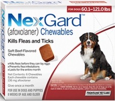 NexGard is a monthly soft chewable that kills adult fleas and is indicated for the treatment and prevention of flea infestations (Ctenocephalides felis) and the treatment and control of American Dog Tick infestations (Dermacentor variabilis) in dogs.